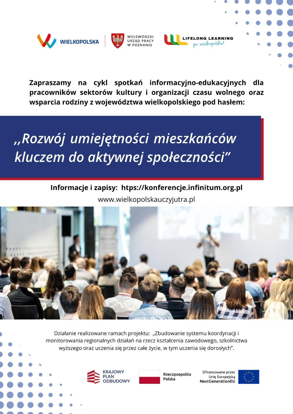 - Rozwój umiejętności mieszkańców kluczem do aktywnej społeczności – skierowany do przedstawicieli instytucji: kultury, organizacji czasu wolnego, wsparcia rodziny, a także do jednostek samorządu terytorialnego, organizacji pozarządowych oraz wszystkich, którzy wspierają rozwój umiejętności i kompetencji poprzez działania społeczne i kulturalne.