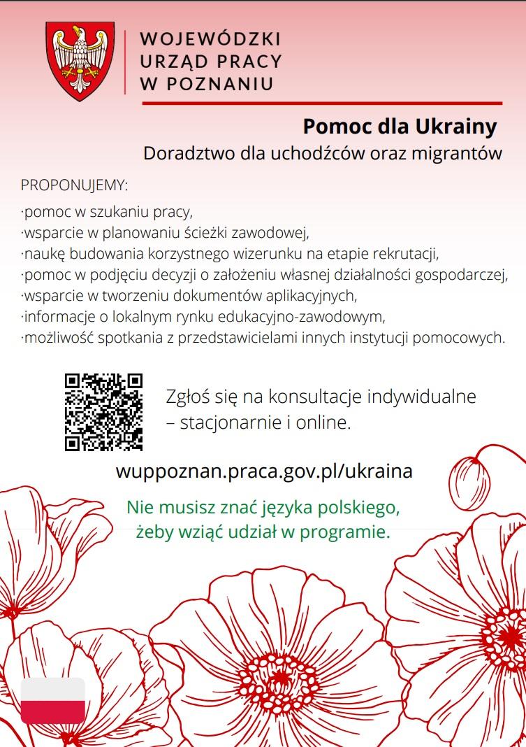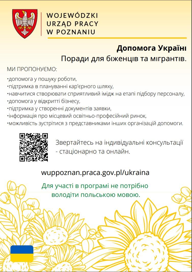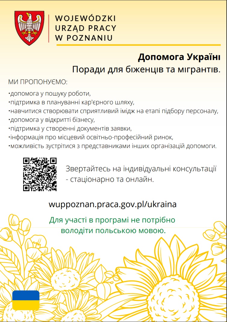 Одним із напрямів підтримки, якої потребують біженці з України, що прибувають до Польщі у зв'язку з триваючим збройним конфліктом, а також мігранти, які раніше прибули до нашої країни з метою працевлаштування, є допомога у зорієнтуванні в польських реаліях, у т.ч. на місцевому ринку праці. Хоча особисте та професійне положення людей може кардинально відрізнятися, спільним, безумовно, є необхідність адаптації до нових умов, у тому числі ринкових та професійних. У відповідь на ці потреби було розроблено проект "Допомога Україні - консультації для біженців та мігрантів", який реалізується Воєводським управлінням праці в Познані з філіями в Каліші, Коніні, Лешно та Пілі.